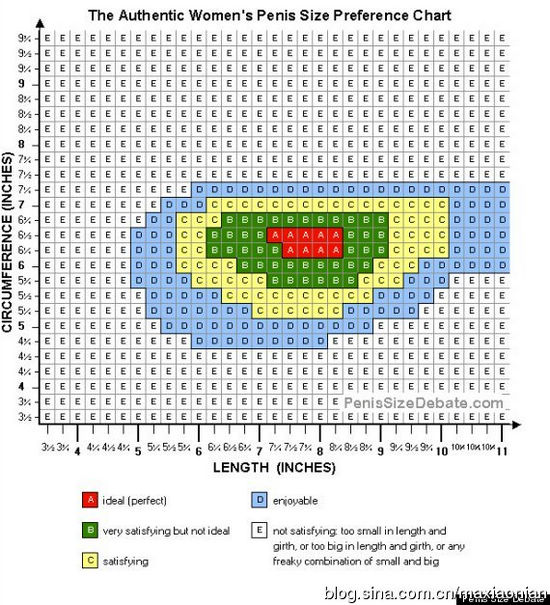 这是一张阴茎大小和粗细与女性性满意度关系的图表,纵轴是周长(粗细),横轴是长度,单位都是英寸(1英寸约为2.5厘米)。红色代表理想的长度和粗细范围;绿色为非常满意,但是不理想;黄色为满意;蓝色为令人愉快的;白色为不满意:要么太短太细,要么太长太粗,要么长短粗细不成比例。当然这个图标仅仅代表西方社会的调查数字,黄种人恐怕不能照搬这样的结果。